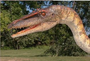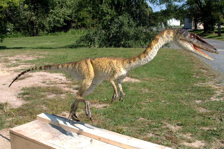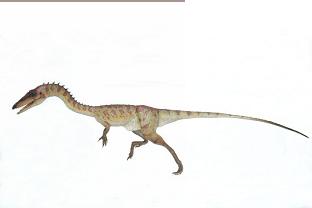 Coelophysis (pronounced SEE-low-FIE-sis) was a small, lightly-built dinosaur that walked on two long legs. This predator was about 9 feet long (2.8 m). It had light, hollow bones (hence its name), a long, pointed head with dozens of small, serrated teeth, three clawed fingers on its hands, and a long neck.